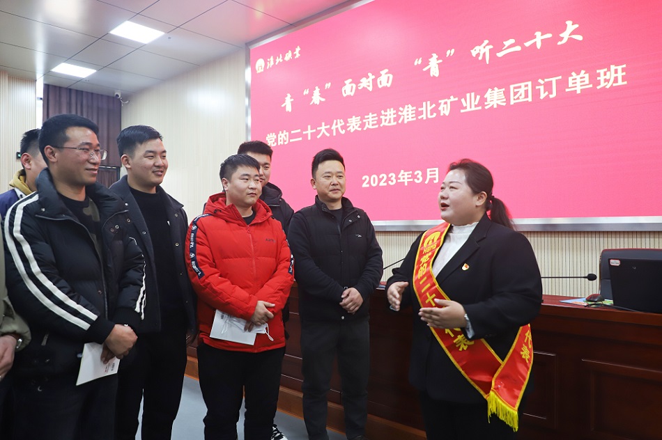 (2023年3月2日,黨的二十大代表劉婉春走進淮北礦業(yè)集團“訂單班”,面對面向訂單班學員宣講黨的二十大精神。)