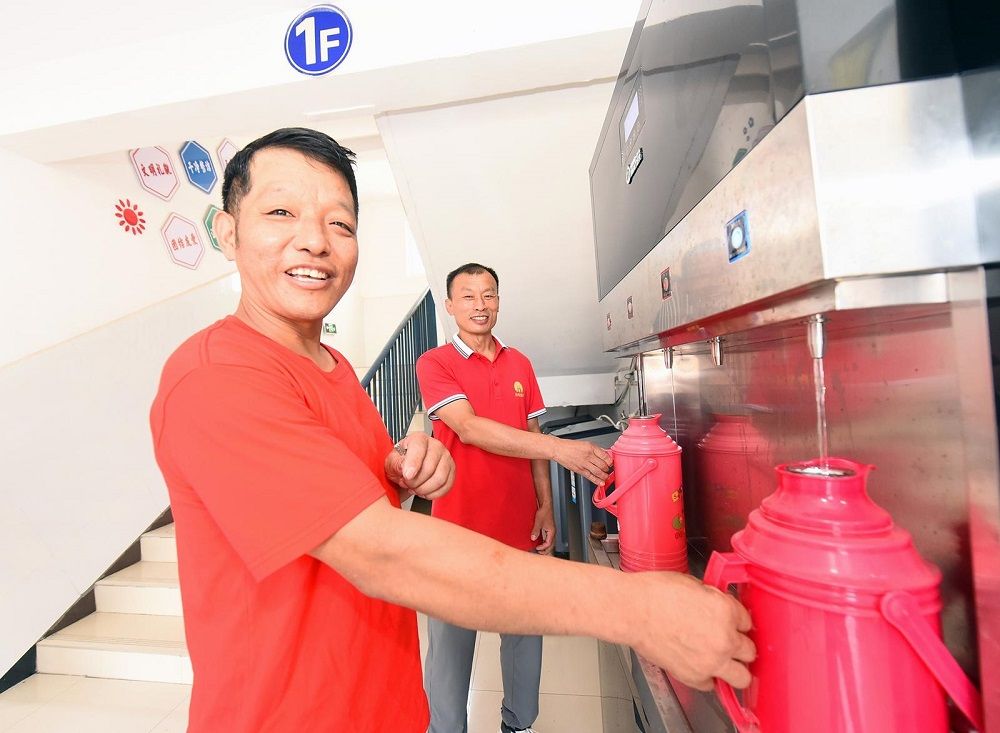 孫疃礦2名職工使用智能凈水機(jī)。(陳 更 攝)
