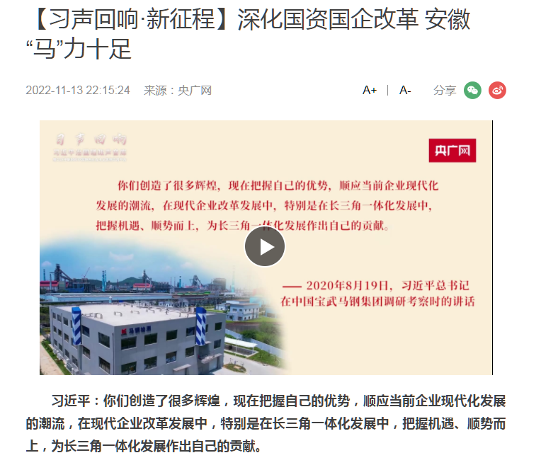 搶抓發(fā)展機(jī)遇,敢為時(shí)代先鋒。國(guó)企改革三年行動(dòng)以來(lái),安徽國(guó)資國(guó)企深化改革創(chuàng)新,不斷轉(zhuǎn)型突破,推動(dòng)省屬企業(yè)高質(zhì)量發(fā)展邁上新臺(tái)階。2021年,安徽省屬國(guó)有企業(yè)經(jīng)營(yíng)業(yè)績(jī)創(chuàng)歷史最好水平。今年上半年,省屬企業(yè)資產(chǎn)總額首次突破2萬(wàn)億元。目前,安徽省國(guó)企改革三年行動(dòng)的129項(xiàng)重點(diǎn)任務(wù)已基本完成。央廣網(wǎng)、人民網(wǎng)、中國(guó)網(wǎng)、中華網(wǎng)、光明網(wǎng)、環(huán)球網(wǎng)、中國(guó)經(jīng)濟(jì)網(wǎng)、中國(guó)青年網(wǎng)、中青在線、新浪網(wǎng)、網(wǎng)易網(wǎng)、騰訊網(wǎng)、搜狐網(wǎng)、鳳凰網(wǎng)等15家全國(guó)主流媒體及30余家省級(jí)主流媒體對(duì)此進(jìn)行了集中報(bào)道。