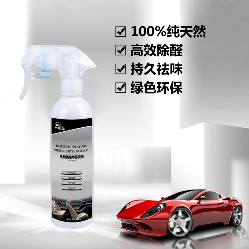 wallz 汽車除甲醛噴劑,利用除甲醛專用生物酶及植物提取液,降解甲醛分子,使之生成無毒害的物質,擁有24小時長效保護,時效可長達30天,安全無毒,無刺激性氣味,無腐蝕性,能持續殺滅98%以上的細菌和清除90%以上的甲醛異味,防止交叉感染,本產品只含有純天然生物活性物質,高效除醛,持久祛味,綠色環保,母嬰安全,是保持您車內環境干凈清新的最佳選擇。